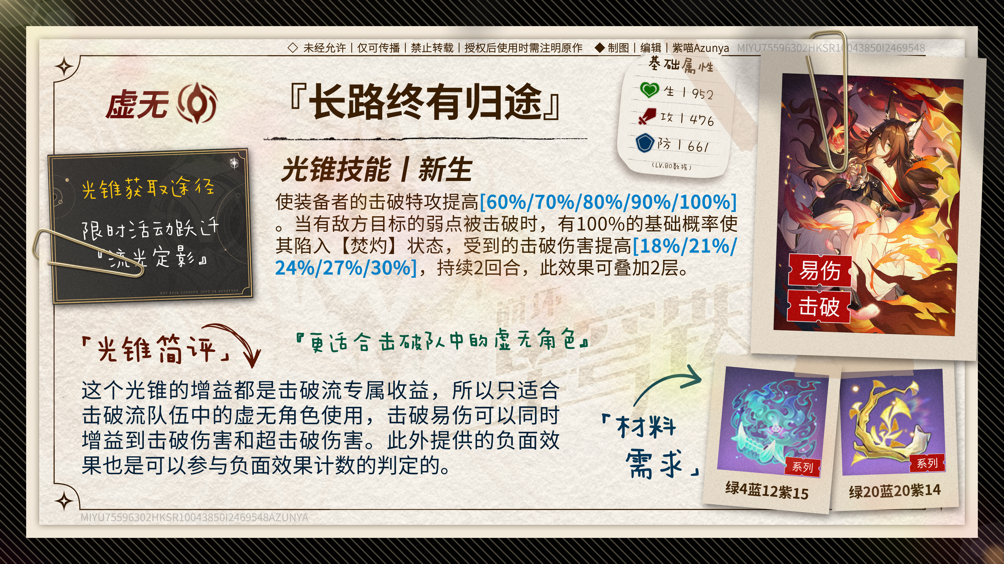 这是一个数值带一点点机制的光锥,给装备者提供大量击破特攻,不仅能提高削韧效率和超击破伤害,还能降低追求忘归人额外能力要求标准的配装压力。此外当敌方目标弱点击破时,还会提供可以叠加2层的击破易伤负面状态,忘归人的【云火昭】也可以触发。这个负面状态还可以作为负面计数参与部分角色的机制计算中。