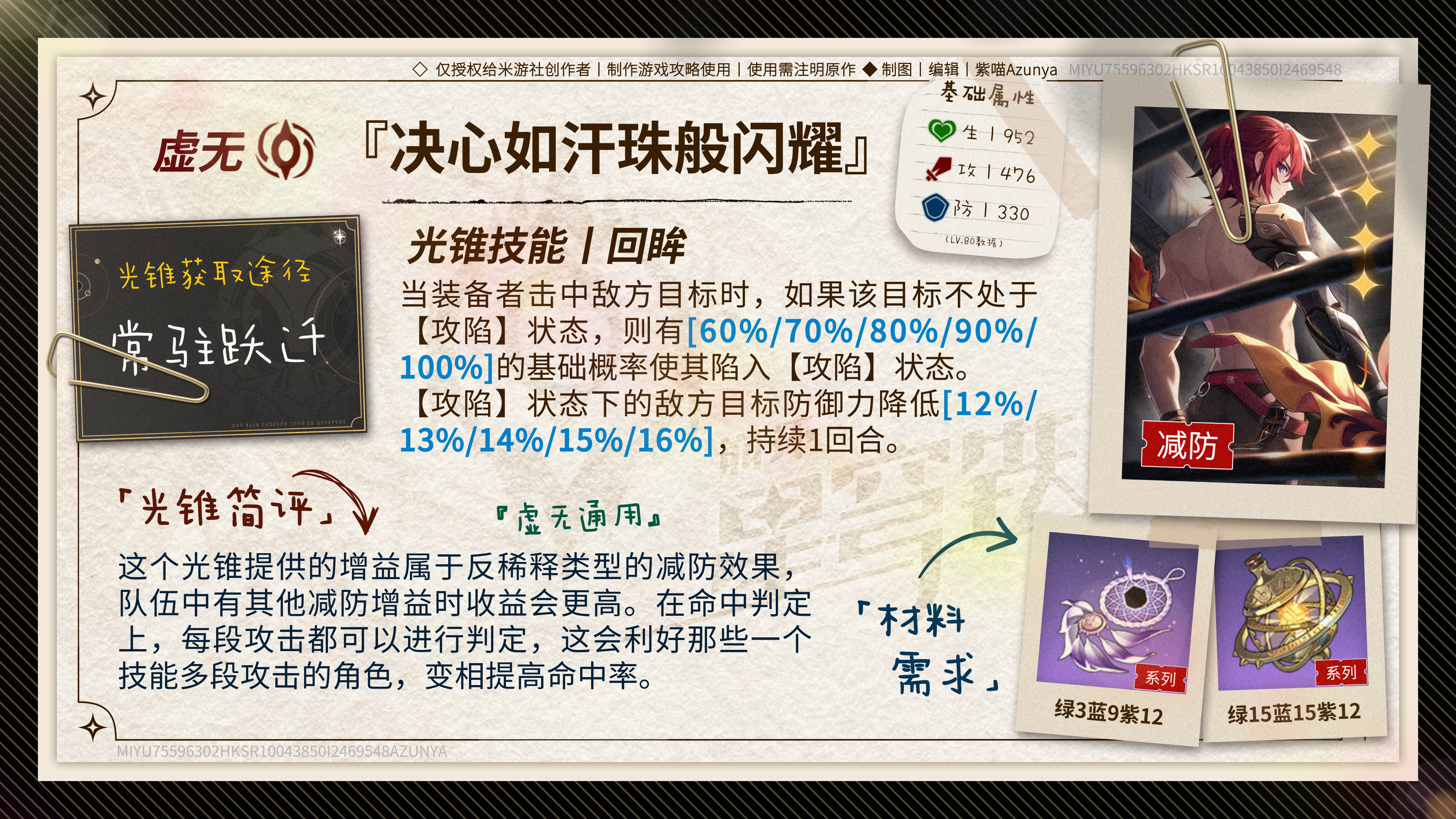 这个光锥提供减防效果,在减防达到100%之前是一个反稀释的增长曲线,配合忘归人自己的减防能力和队伍其他减防增益可以获得更大的收益,但基础概率较低,需要高命中或者高叠影来弥补。切记如果队伍减防已达到100%就不要带这个了。
