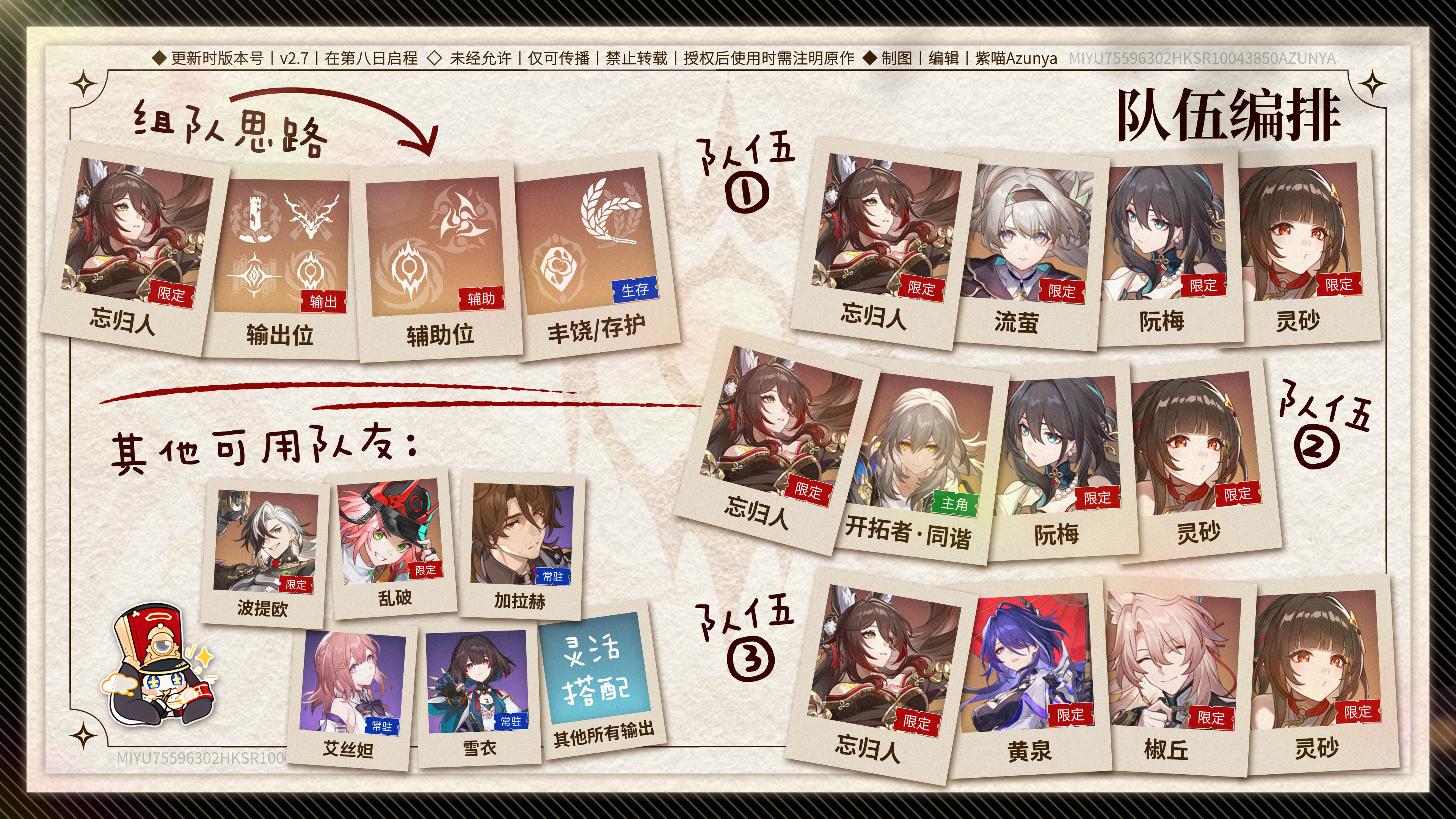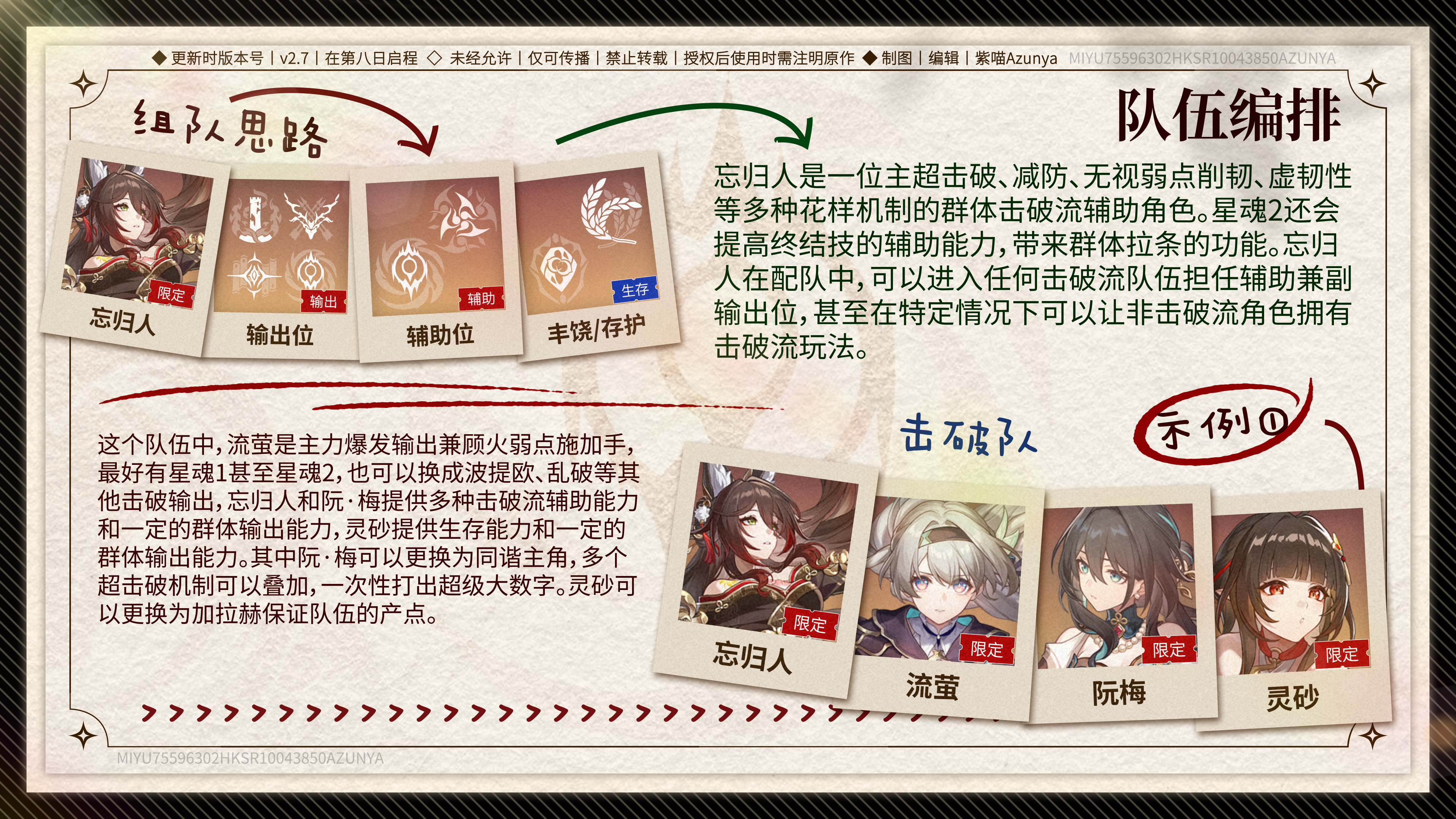 这个队伍是偏整活但意外好用的队伍,全击破流辅助队。忘归人、灵砂、同谐主负责主削韧和超击破出伤,阮·梅提供击破效率和抗性乘区的增益,并且在击破和云火昭击破时提供额外伤害补充。忘归人、同谐主和阮·梅提供的大量推条可以让敌人几乎动不了,所以在确认生存压力很低的情况下,也可以把灵砂换成流萤等击破流输出。