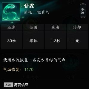 3甘霖:单体治疗 即右键 读条无法移动技能 消耗资源(治疗)