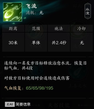 2飞流:单体攻击/治疗 即左键 分为四段 可长按 无gcd (攻击/治疗)