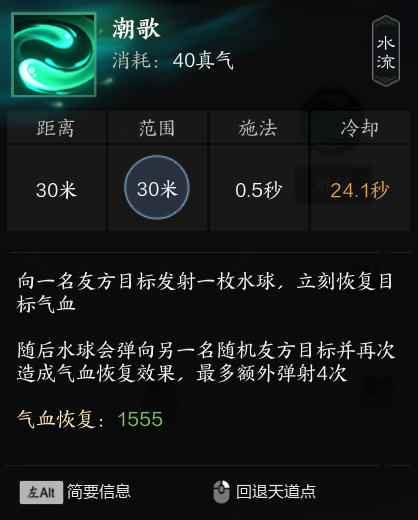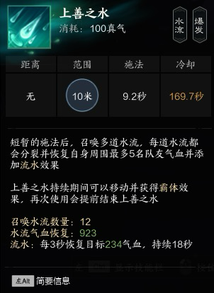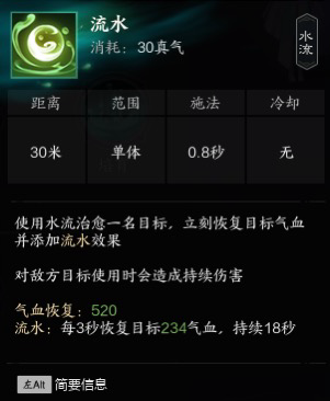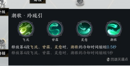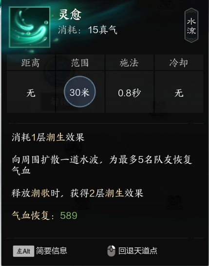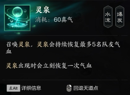 建议大技能优先级为灵泉,小技能用潮歌灵愈刷cd剩下用单抬修血