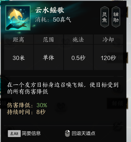 1云水鳐歌:指定单体减伤技能 一般给t或者奶妈自保 长cd