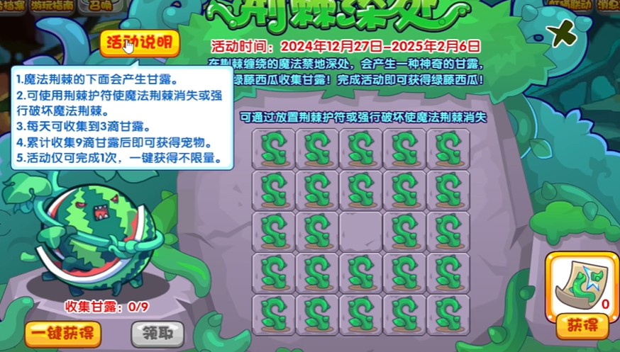 洛克王国荆棘深处是全新推出的活动之一,还有很多的小伙伴不清楚这个活动要怎么去完成,今天给大家带来了相关的攻略,那么下面就是具体的内容. 洛克王国荆棘深处攻略 首先点击获得道具,需要用到木灵石,一个木灵石可以制作三个荆棘护符。 木灵石获得:点击查看 然后去清除藤蔓,可以选择战斗清除,战斗非常的简单,也可以使用道具来清楚,和泡泡堂的玩法类似。 清除之后有甘露就点击,需要9个,一天三个。 本文内容来源于互联网,如有侵权请联系删除。