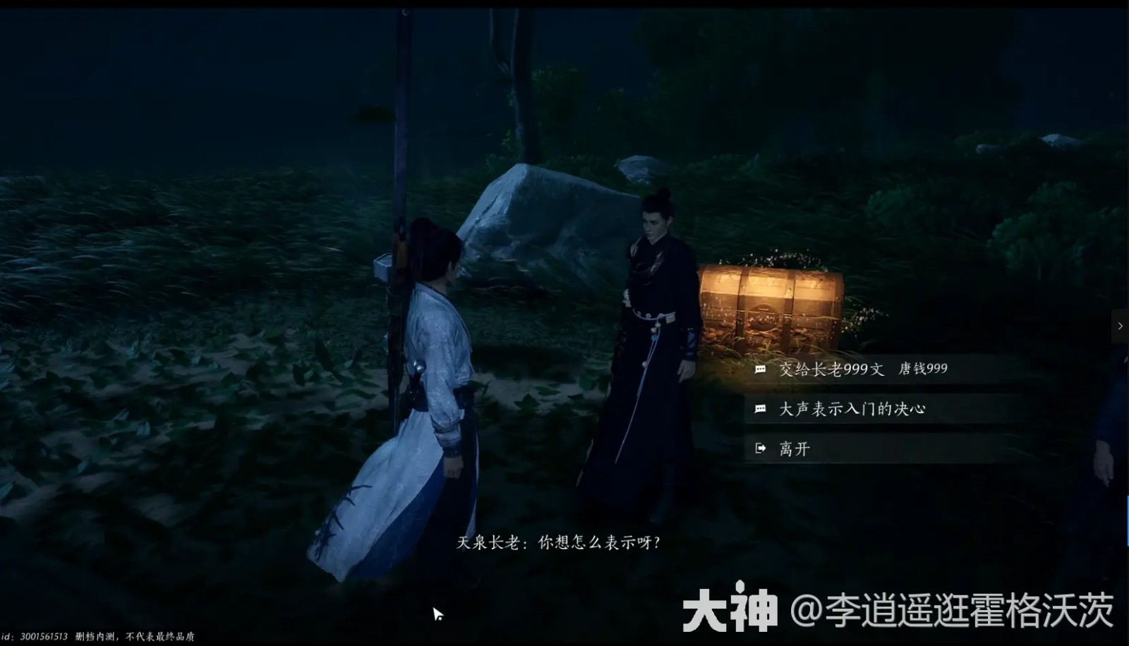 购买消息后根据任务指引图标一路找到天泉长老,有了前面的实验,这里根据剧情逻辑笔者直接选择了【交给长老999文】,大声表决心有没有用没试过。长老身后的大宝箱暂时开不了。