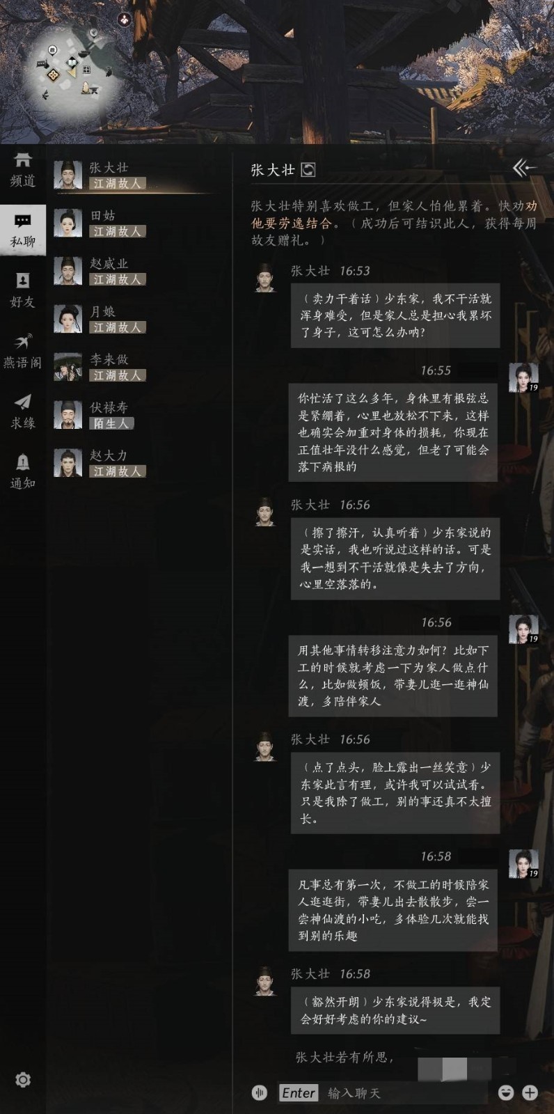 燕云十六声中的NPC可以通过对话提升好感度,结交之后就能获得好感度赠礼,今天给大家带来了张大壮对话攻略,还有小伙伴不清楚要怎么对话,那么下面就是具体的内容.