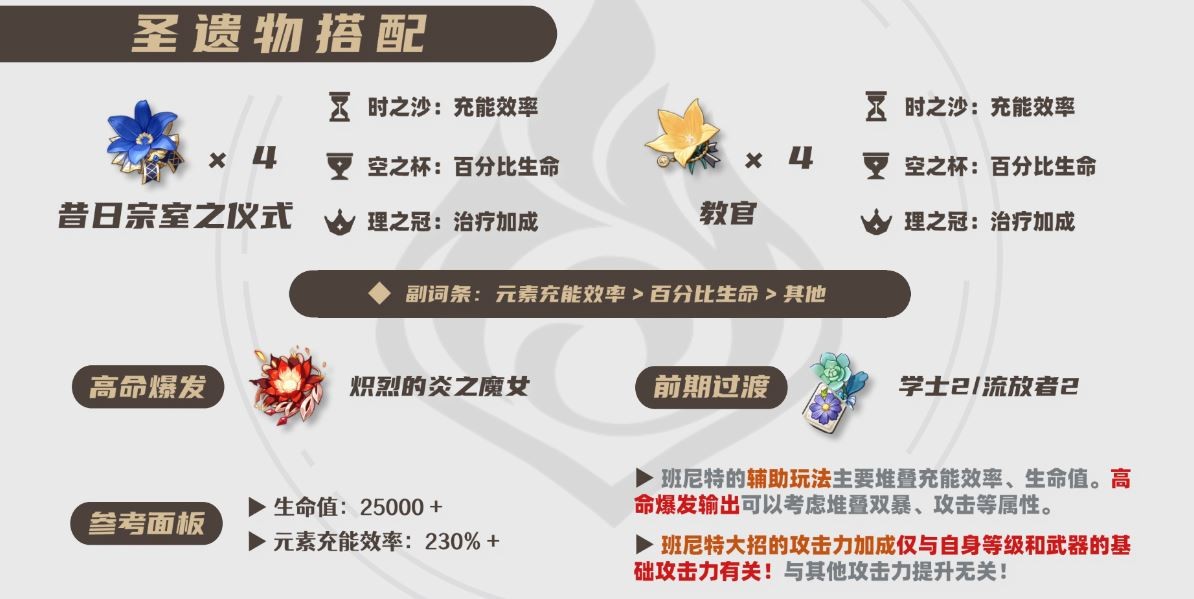 配合反应输出角色时,可选择「教官」4件提高角色元素精通;配合直伤输出的攻击倍率角色时可考虑「昔日宗室之仪」4件。