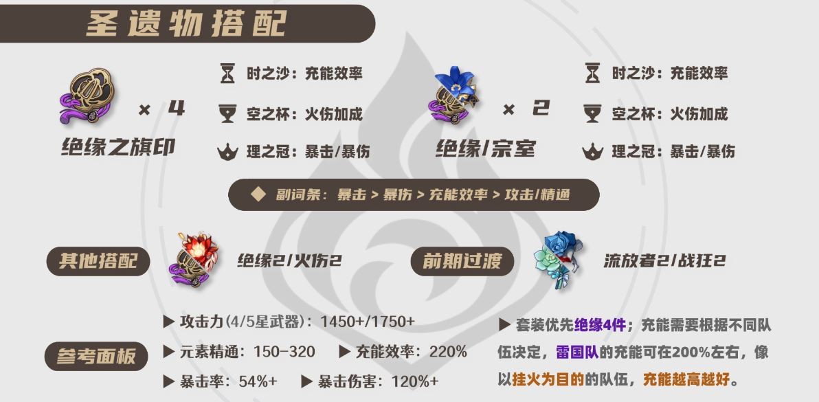 所以,当前可以选择【绝缘之旗印】4件套,其2件套可以提升充能效率20%,而4件套中提升自身的充能效率可以反哺提升元素爆发伤害;