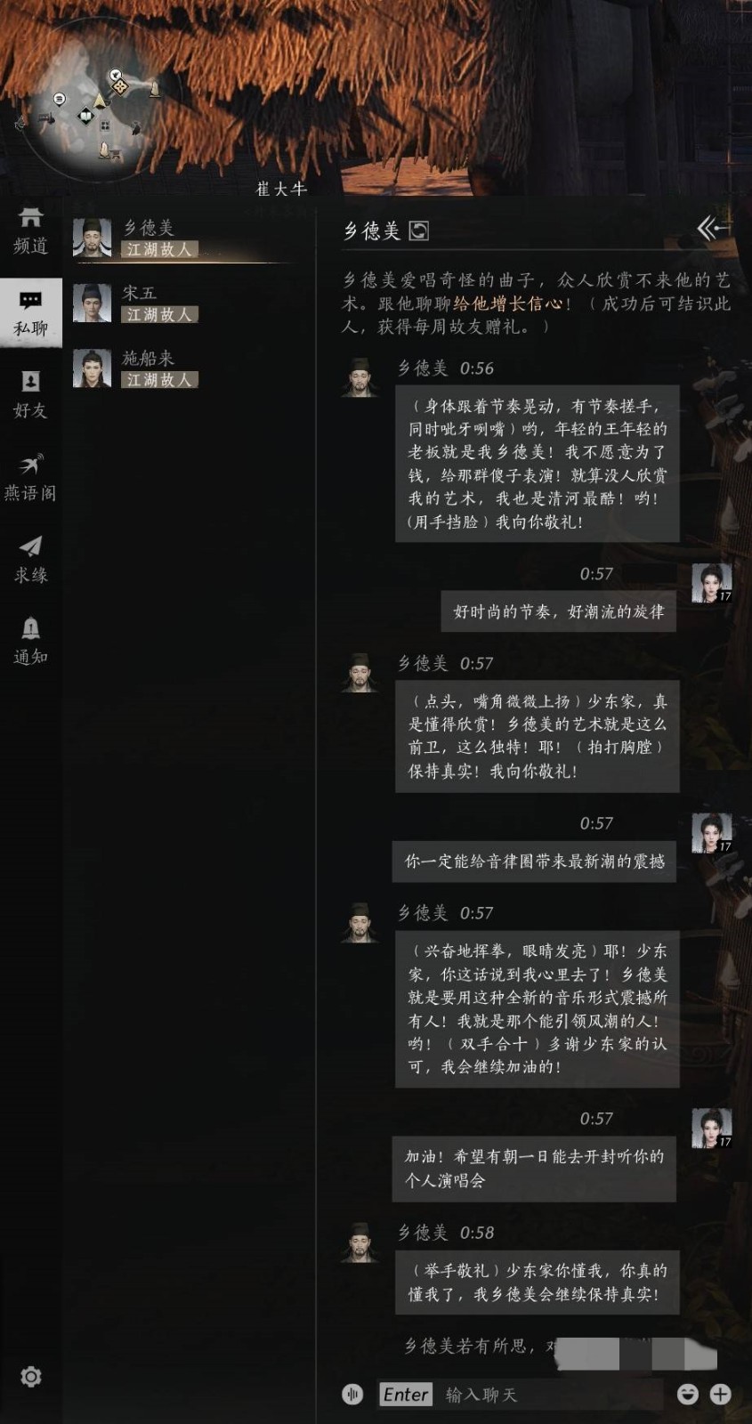 乡德美喜欢唱rap,需求是让玩家给他增加信心,大致的聊天思路就是猛夸他的歌和演唱就行。