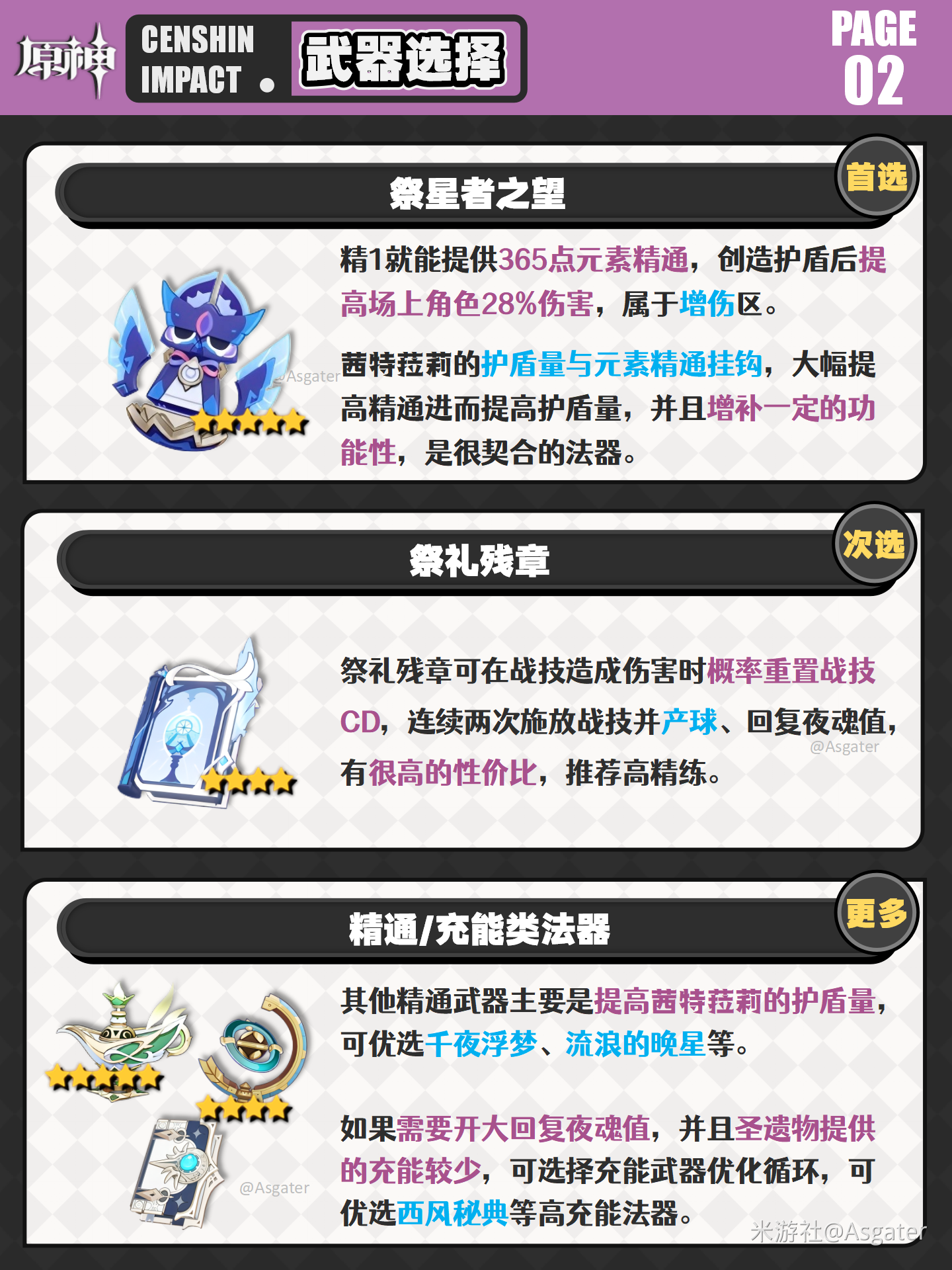精1就能提供365点元素精通,创造护盾后提高场上角色28%伤害,属于增伤区。茜特菈莉的护盾量与元素精通挂钩,大幅提高精通进而提高护盾量,并且增补一定的功能性,是很契合的法器。