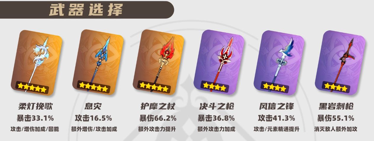 ◆上述提及的武器有啥用啥。4/5星武器实在没有,可暂用【白缨枪】来提高暴击率。
