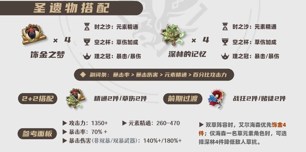 双草阵容时,优选【饰金之梦】4件;仅艾尔海森1名草元素角色时,可考虑【深林的记忆】4件。