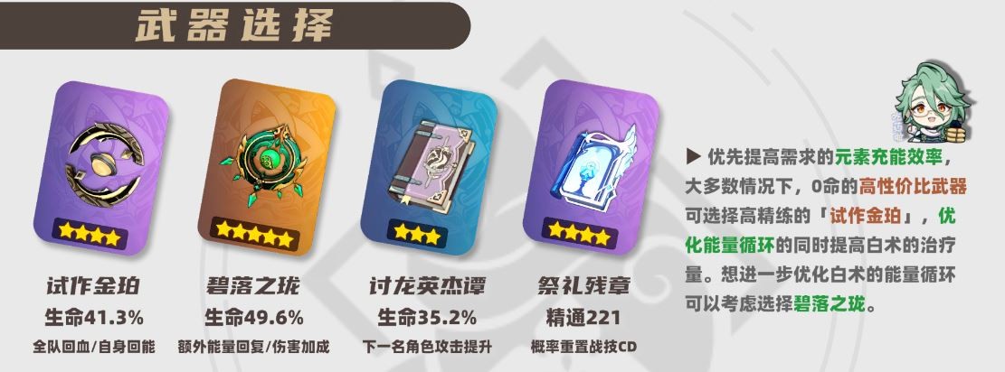 优先提高需求的元素充能效率大多数情况下,0命的高性价比武器可选择高精练的「试作金珀」,优化能量循环的同时提高白术的治疗量。想进一步优化白术的能量循环可以考虑选择碧落之珑。