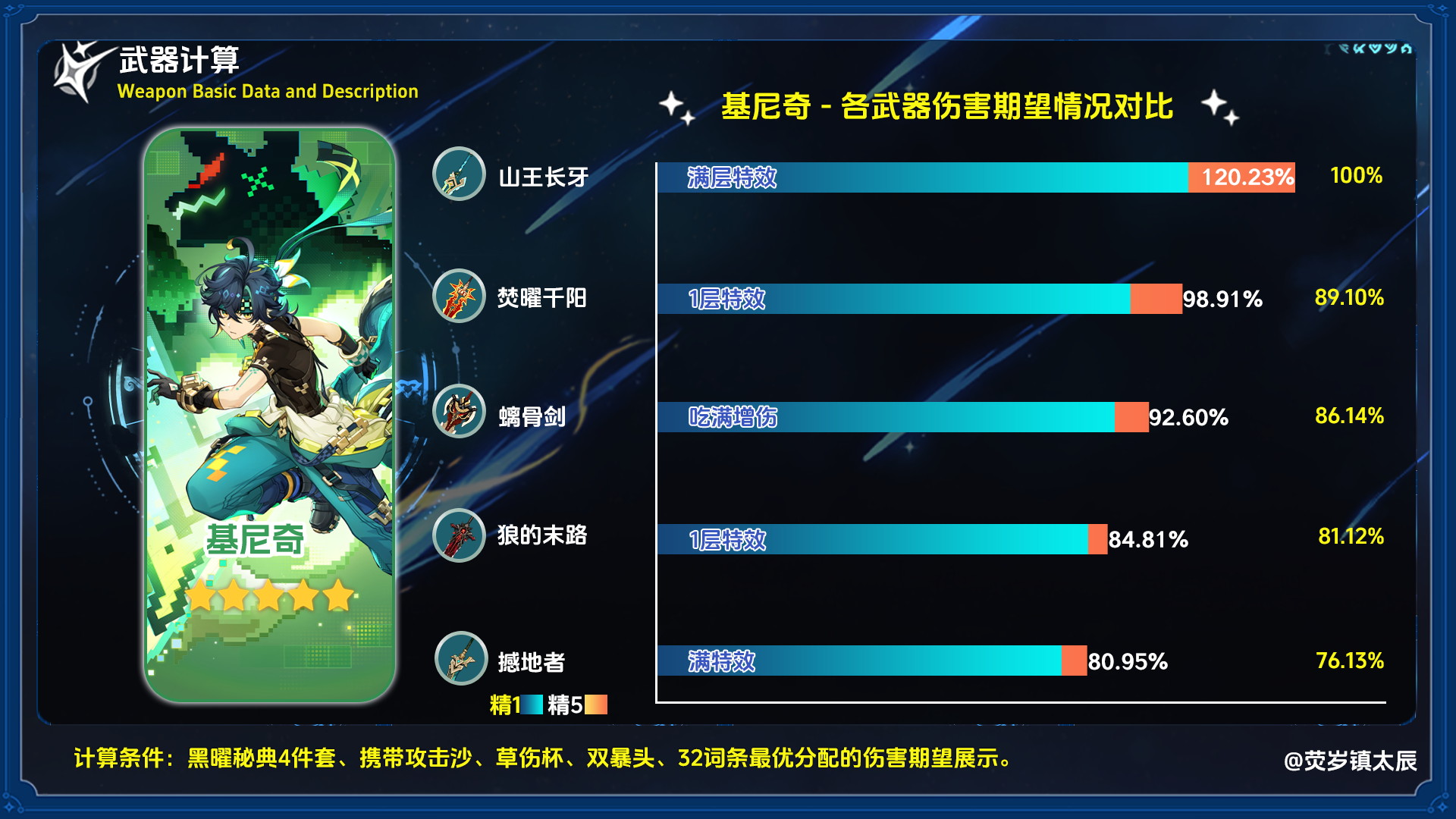 再来看看基尼奇,虽然精5的「焚曜千阳」也打不过精1的「山王长牙」,但即便是精1的「焚曜千阳」,也有着89%的伤害期望。