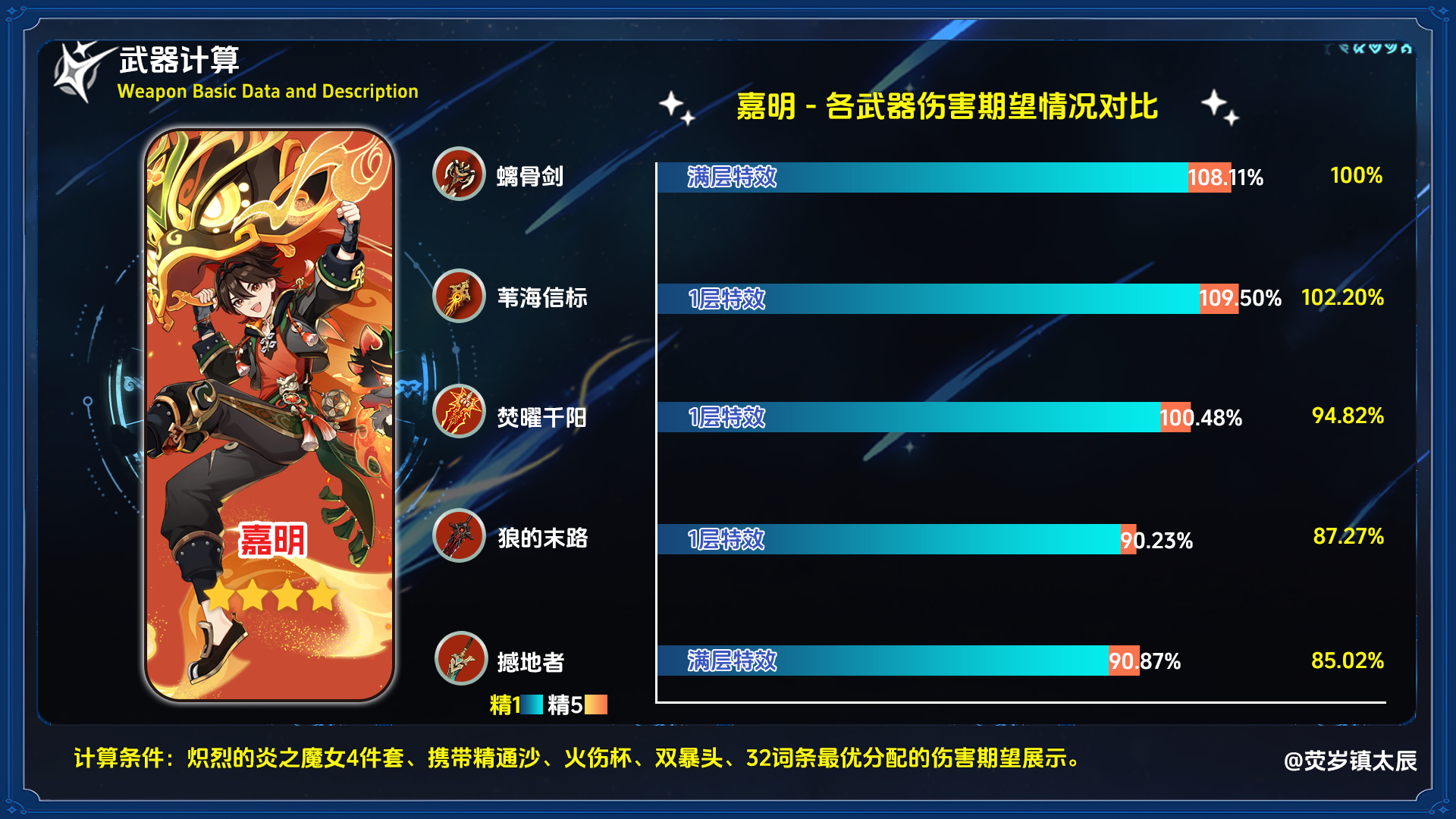 对于嘉明来说,「焚曜千阳」同样有着相当不错的表现,由于只能吃到一半特效,较其他双手剑并没有拉开差距,即便是精炼1阶的撼地者,与「焚曜千阳」仅仅不到10%的差距,可以作为备选使用。