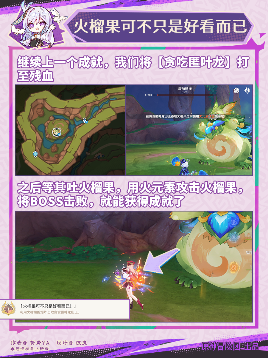 就在最近原神终于上线了5.3版本给我们带来火之国的新冒险,这次版本更新还上线了许多新内容,有新角色,新地图,新任务,还有新的成就,那么有小伙伴好奇火榴果可不只是好看而已成就怎么做,下面就来告诉大家。 原神火榴果可不只是好看而已成就攻略 我们将【贪吃匿叶龙】打至残血,之后等其吐火榴果,用火元素攻击火榴果,将BOSS击败,就能获得成就了。 本文内容来源于互联网,如有侵权请联系删除。