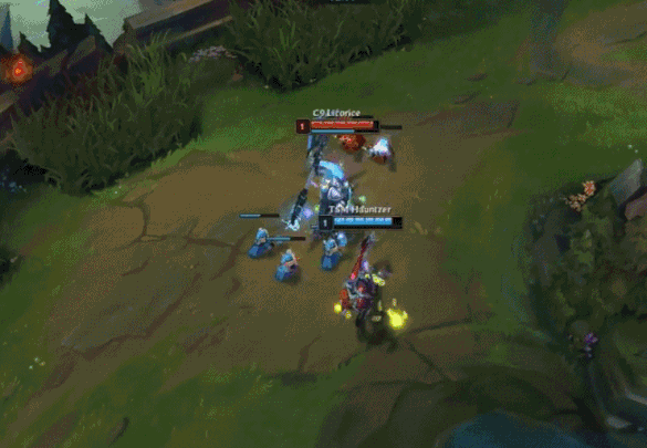 在中期人马可以利用自己推线快和移速高的优点,不断推线不与对方纠缠去中路或者野区找机会,开着E的R对方逃无可逃,C9的人马在这波峡谷先锋的团战就是靠着E-R群体恐惧加回踢击杀了TSM的打野。