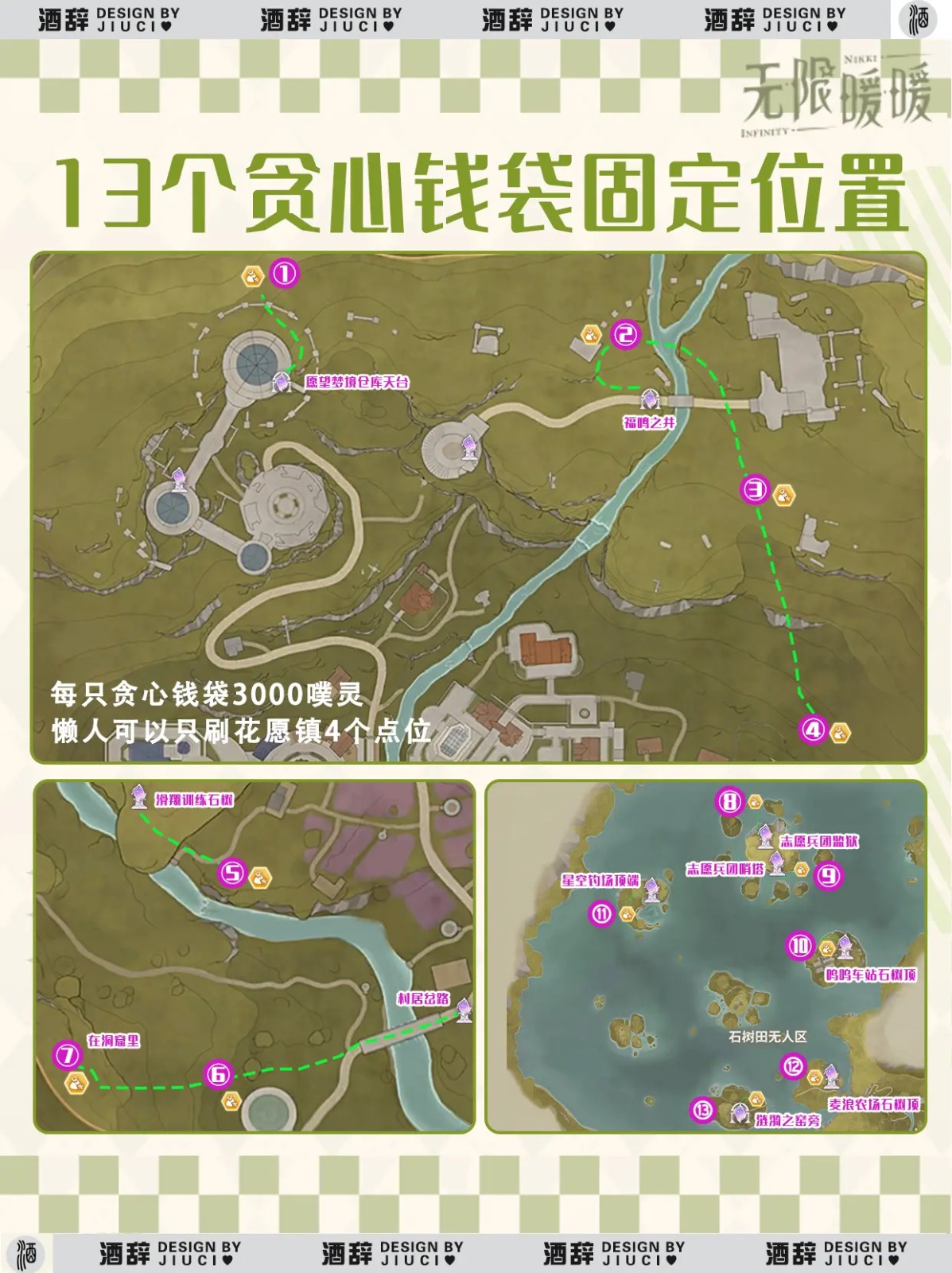 无限暖暖里面有很多的内容,今天给大家带来了游戏里面的贪心钱袋必刷点位,还有小伙伴不清楚游戏里面的贪心钱袋在哪必刷,下面就是里具体的内容. 无限暖暖贪心钱袋必刷点位 13个固定点位贪心钱袋3000/只。 本文内容来源于互联网,如有侵权请联系删除。