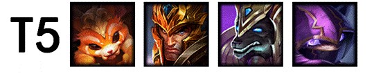 T5级的英雄们基本上对线都非常弱,而且有着各种上位代替品,比如同样是突进团控,猴子能比皇子做的更好,不建议在这个版本用他们冲分,即使是比赛中这些英雄出场也是为了战术设计。