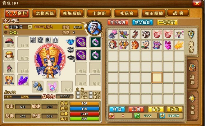 通过个人资料可以查看到角色的武器、装备、基本属性等;背包内可以保存各种物品,还可将不需要的物品进行精炼。背包下方可查看点券数量、绑定点券数量、金币数量。