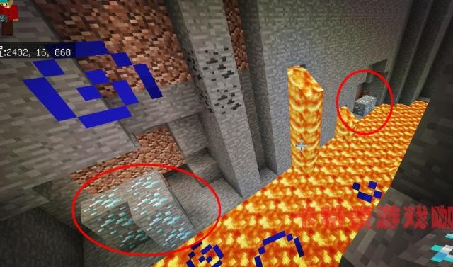 在坐标位置为:2432、16、868的位置,我们就来到了另外一个大峡谷,在这里发现了丰富的钻石资源,一共是8块,这下钻石也有了。