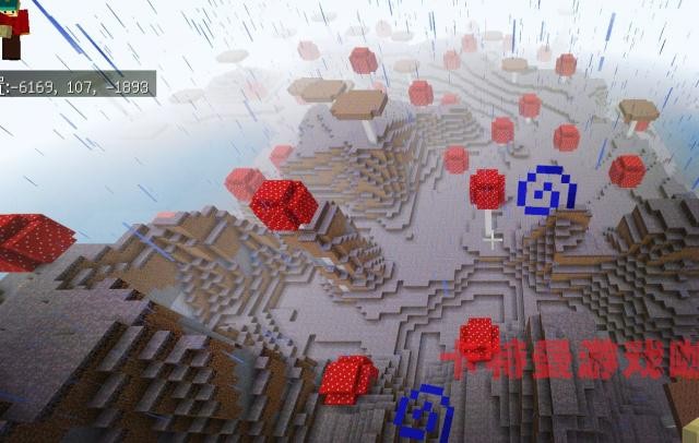他还提到,这个种子还有一个蘑菇岛,地址坐标是:-6169、107、-1893的位置,就来到了这篇蘑菇岛区域,这片区域看起来非常的辽阔。这也是非常有稀有的地域了,非常丰富。