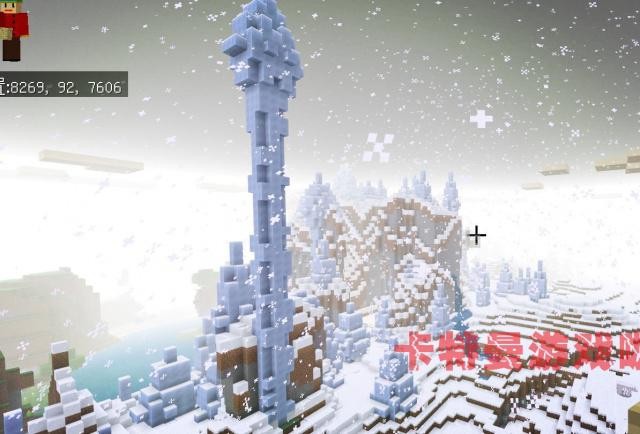 接下来的旅游清单是雪村庄,根据他的坐标来到这片雪域,但是赚了好多圈并没有发现村庄。卡特曼在想可能他推荐的种子是老版本的种子,这片区域的村庄已经消失了。但是不要紧,我们发现了更棒的雪屋,这个坐标是:3104、84、-2756。
