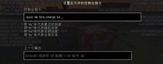 如果数量不填的话默认是64个。如/give AW fire_charge 64 给玩家AW64个火焰弹。