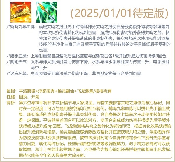 鹤鸣九皋血脉可以提升先手输出效果,降低造成的克制伤害并提升非克制伤害,令自身每次上场首次主动使用技能时获得一定保障。