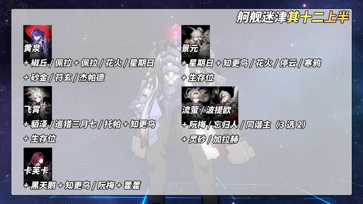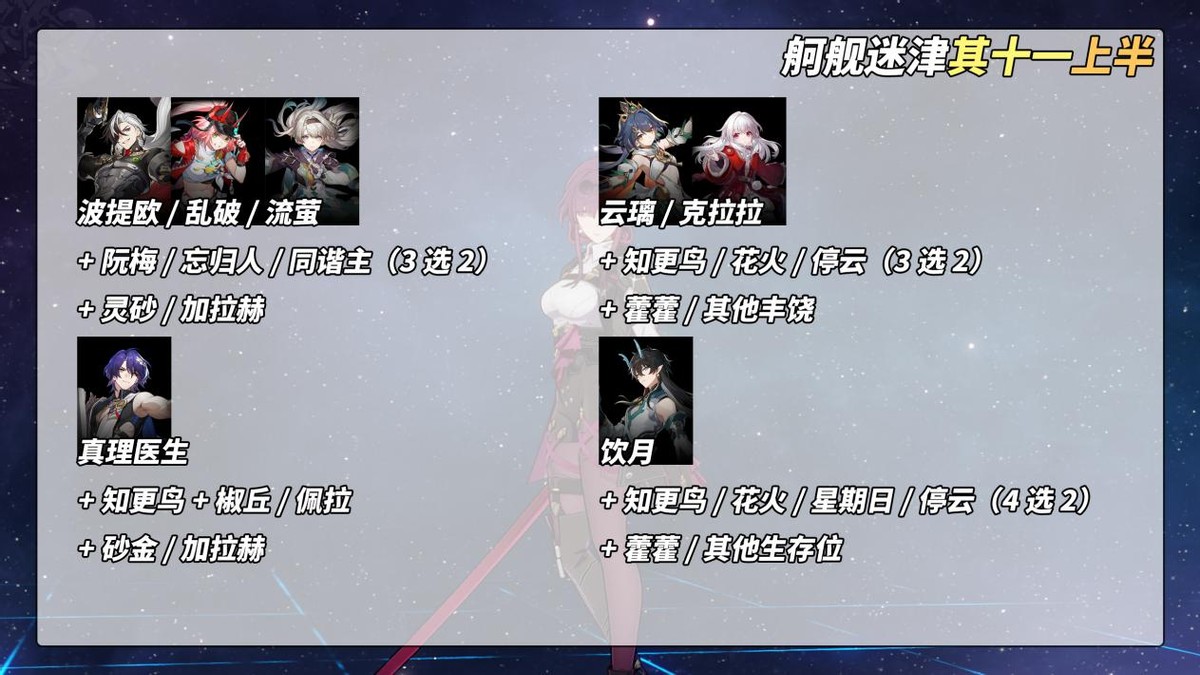 黄泉+椒丘/佩拉/黑天鹅/桑博+佩拉/花火/星期日/卡芙卡+砂金/符玄/杰帕德。