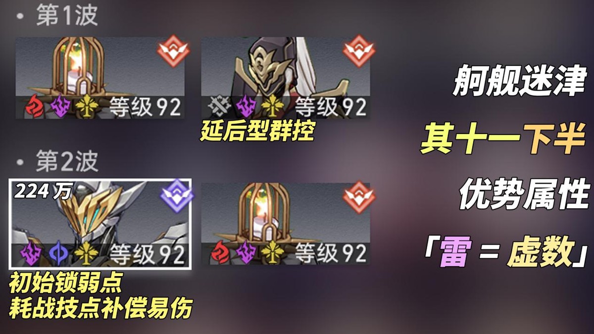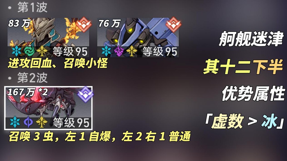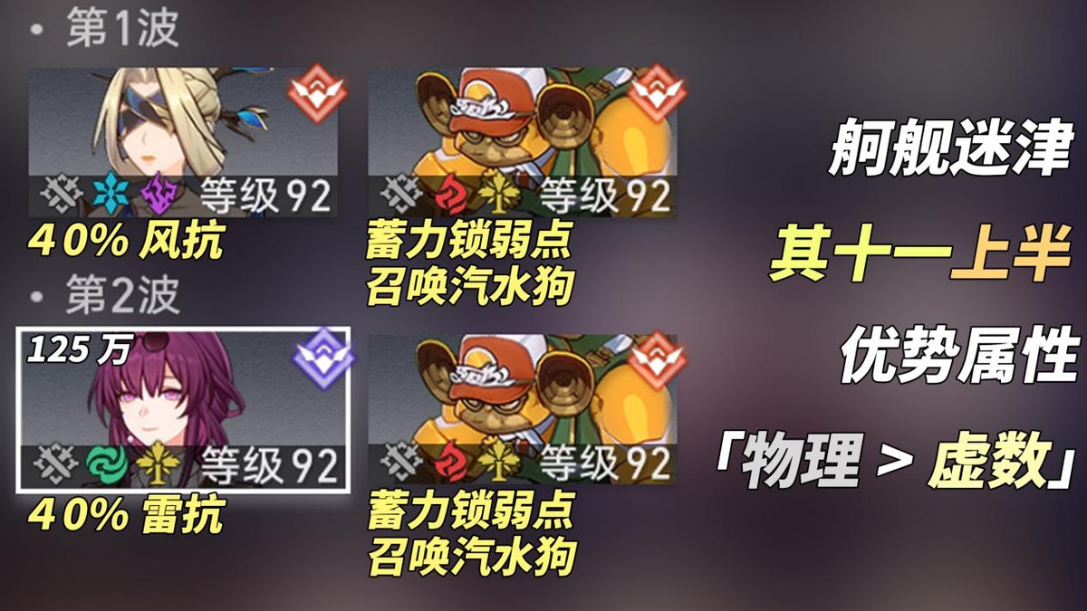 【11层上半】优势属性「物理>虚数」,特殊抗性「承露天人40%风抗、卡芙卡40%雷抗」。