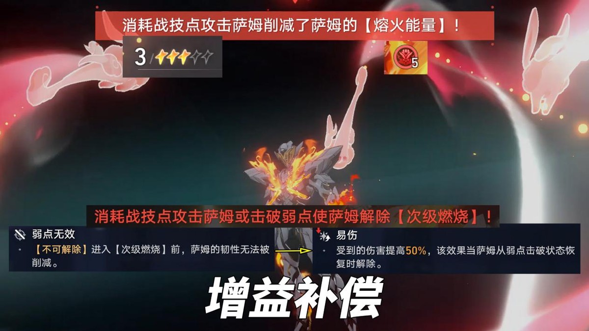萨姆应对策略:初始会锁弱点,当他进入次级燃烧后解除弱点锁定,并燃烧我方战技点。在此期间,消耗5个燃烧战技点或弱点击破,可使其虚弱(50%易伤、恢复全战技点)