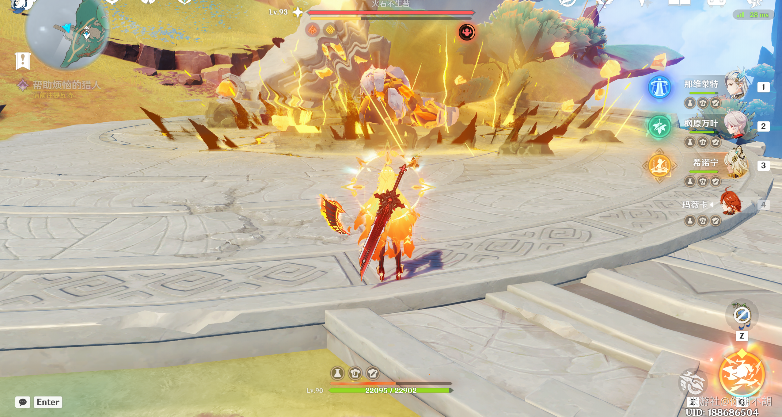 BOSS特性:有一个岩元素护盾和一个热量条,岩元素护盾存在期间BOSS不会受到伤害,热量条累计满之后BOSS会进入虚弱状态,全属性抗性恢复正常。