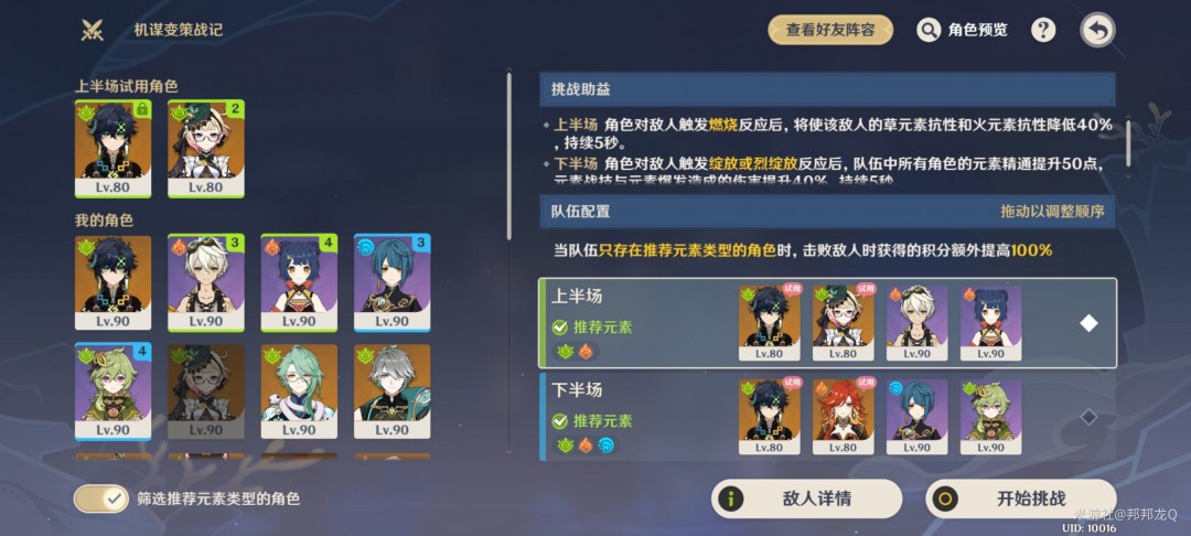 在上半,他给了我们基尼奇和调香师,但是配队锁死了火草元素,基本上只能打燃烧反应。如果你有很强的纯火队伍,那也可以直接上纯火队。然后我们就带两个后台火就行了,所以选择班尼特和香菱。手法的话就调香师先QE或者E,班尼特EQ香菱QE,基尼奇E启动之后AAA E亮了就点了E,E点后Q亮了就Q,没Q不点继续普攻,就这样循环。
