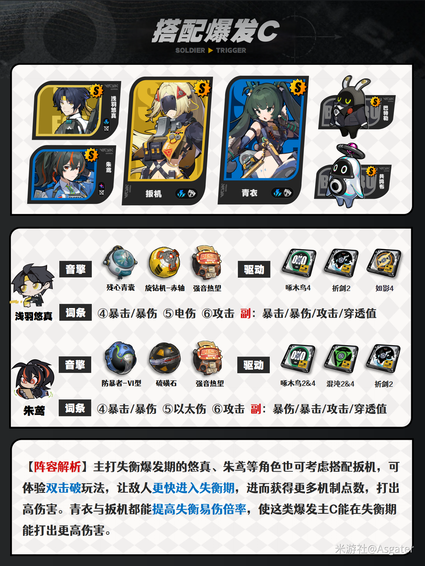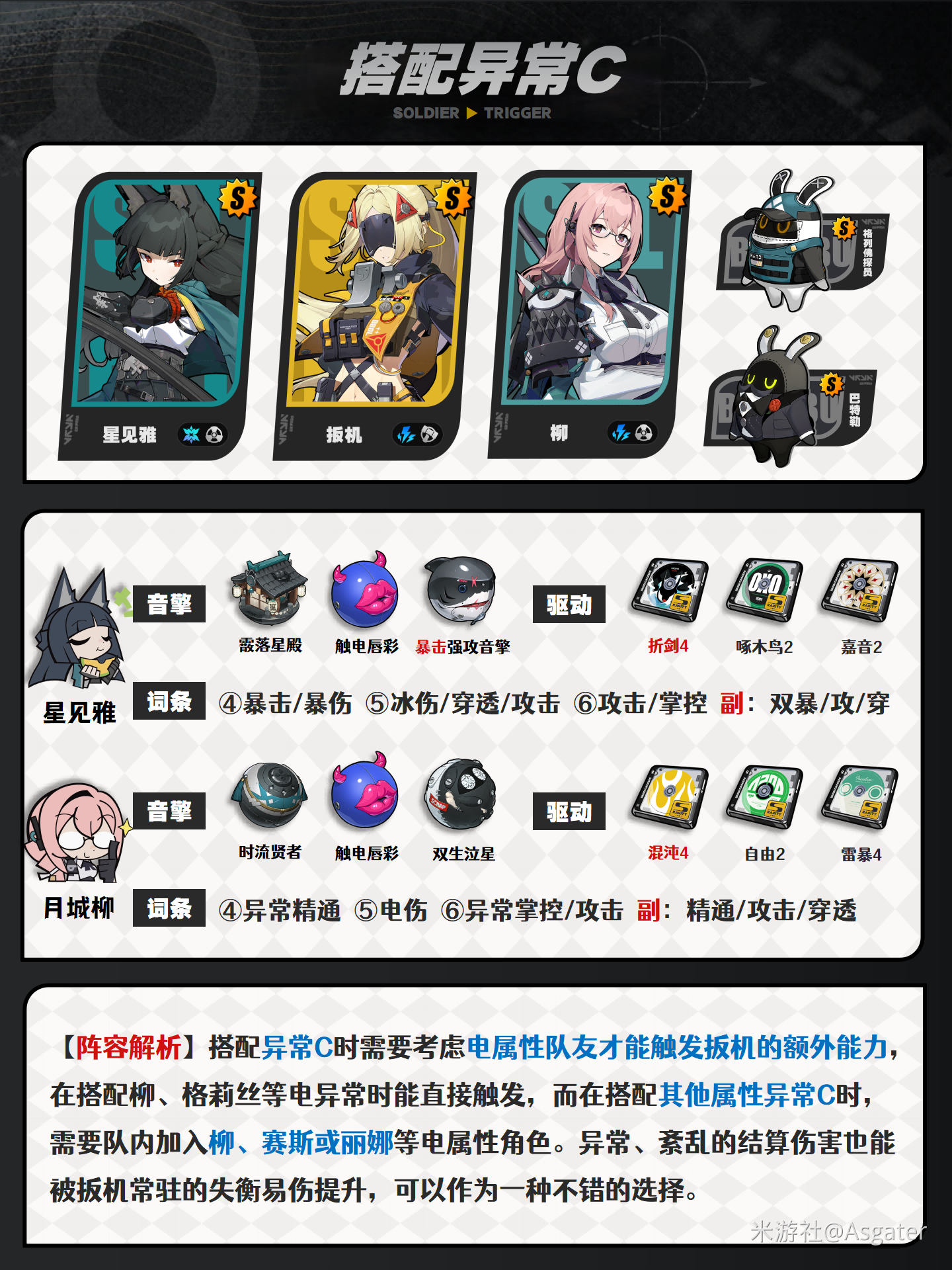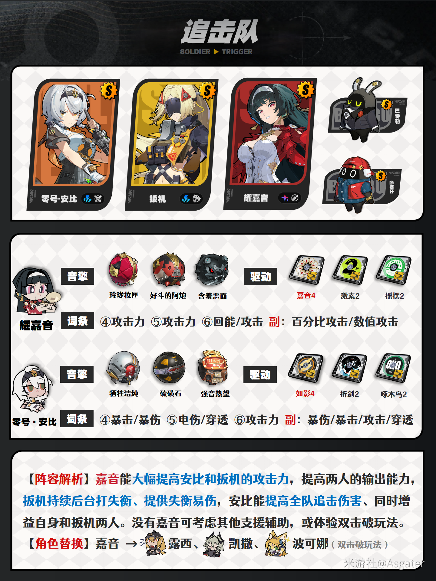① 嘉音能提高全队攻击力,让“安比+扳机”都有不错伤害——想要追求较高上限,扳机的输出不可忽视。