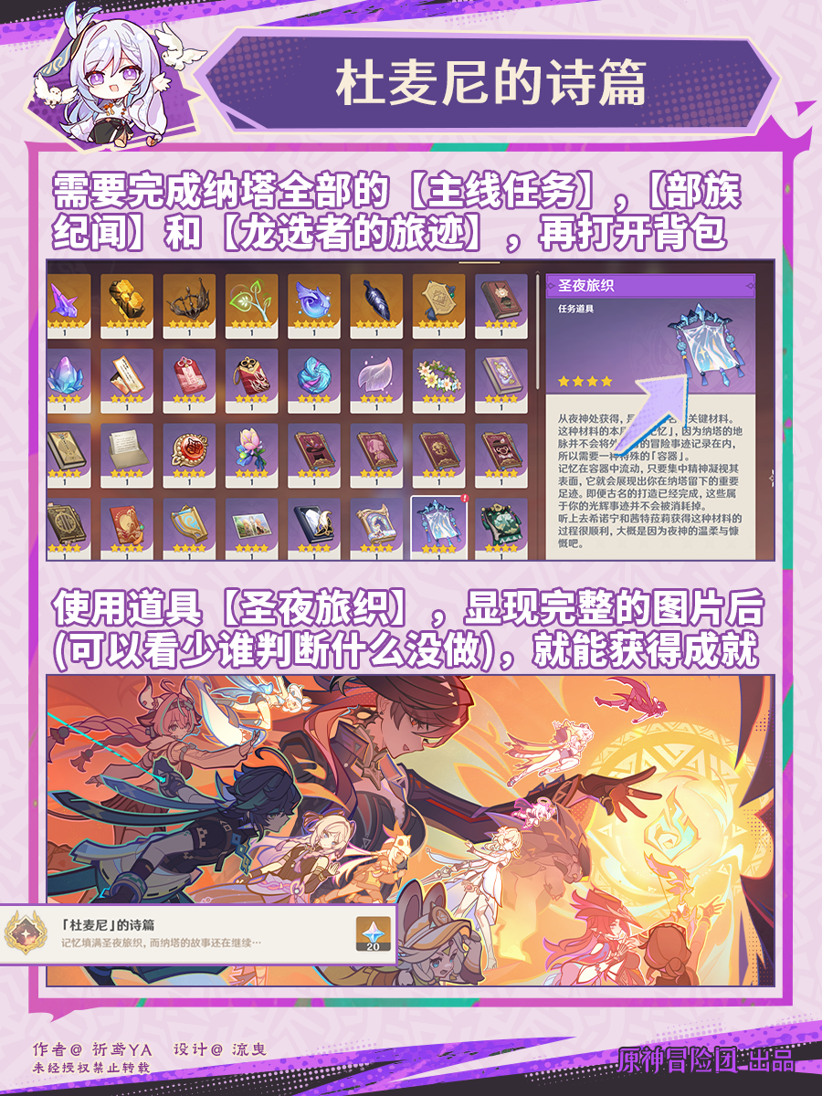 就在最近原神终于上线了5.5版本给我们带来火之国的新冒险,这次版本更新还上线了许多新内容,有新角色,新地图,新成就,那么有小伙伴好奇杜麦尼的诗篇成就怎么做,下面就来告诉大家。 原神杜麦尼的诗篇成就攻略 需要完成纳塔全部的【主线任务】,【部族纪闻】和【龙选者的旅迹】,再打开背包。 使用道具【圣夜旅织】,显现完整的图片后(可以看少谁判断什么没做),就能获得成就。 本文内容来源于互联网,如有侵权请联系删除。