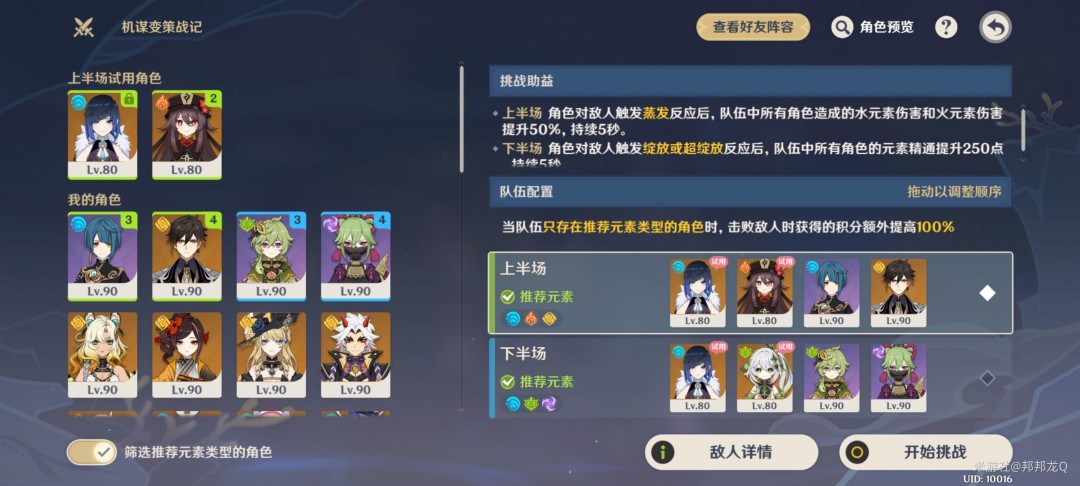 在上半【建议直接上火神和仆人】,四星上行秋基本必带了,剩下一个位置,钟离可以换希诺宁或者卡齐娜(一定要穿勇者套),有适配其他火C的辅助都可以上,芙宁娜,茜特菈莉,班尼特因为要控血不太行,然后胡桃的话也能玩。手法就是可以先手上火,勇者套触发增伤,水系后台放完之后,胡桃A重击跳即可。(我好久不玩零命胡桃了手法实在是改不过来,也确实现在不太舒服,大家可以上其他C奥)