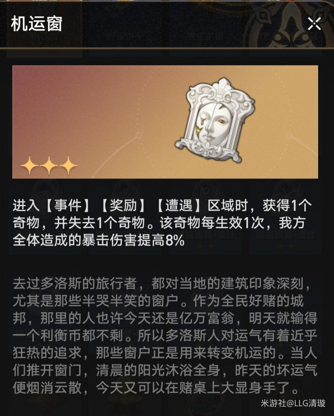 崩坏星穹铁道上线了3.3版本对于差分宇宙也进行了更新,在这个版本也更新了许许多多的新奇物,选择后还有不少效果,有不少小伙伴好奇机运窗奇物效果是什么,那么下面就来告诉大家。 崩坏星穹铁道机运窗奇物效果一览 机运窗 注:这里的奇物获取和丢弃都是自己选的,比那活塞好,配合那刻夏23玩起来很爽 选不到咋么办? 我赌下一期周期演算就有这个,你信吗? 本文内容来源于互联网,如有侵权请联系删除。