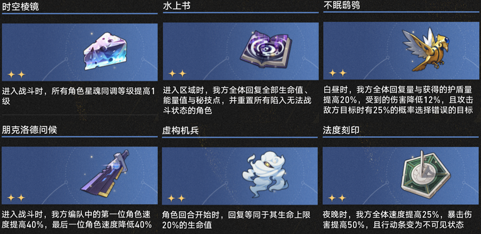 战斗类二星奇物里最强的显然是【时空棱镜】和【水上书】——【时空棱镜】可以提供一个额外星魂,而【水上书】则可以保证你以满血满能量满秘技状态进入战斗。