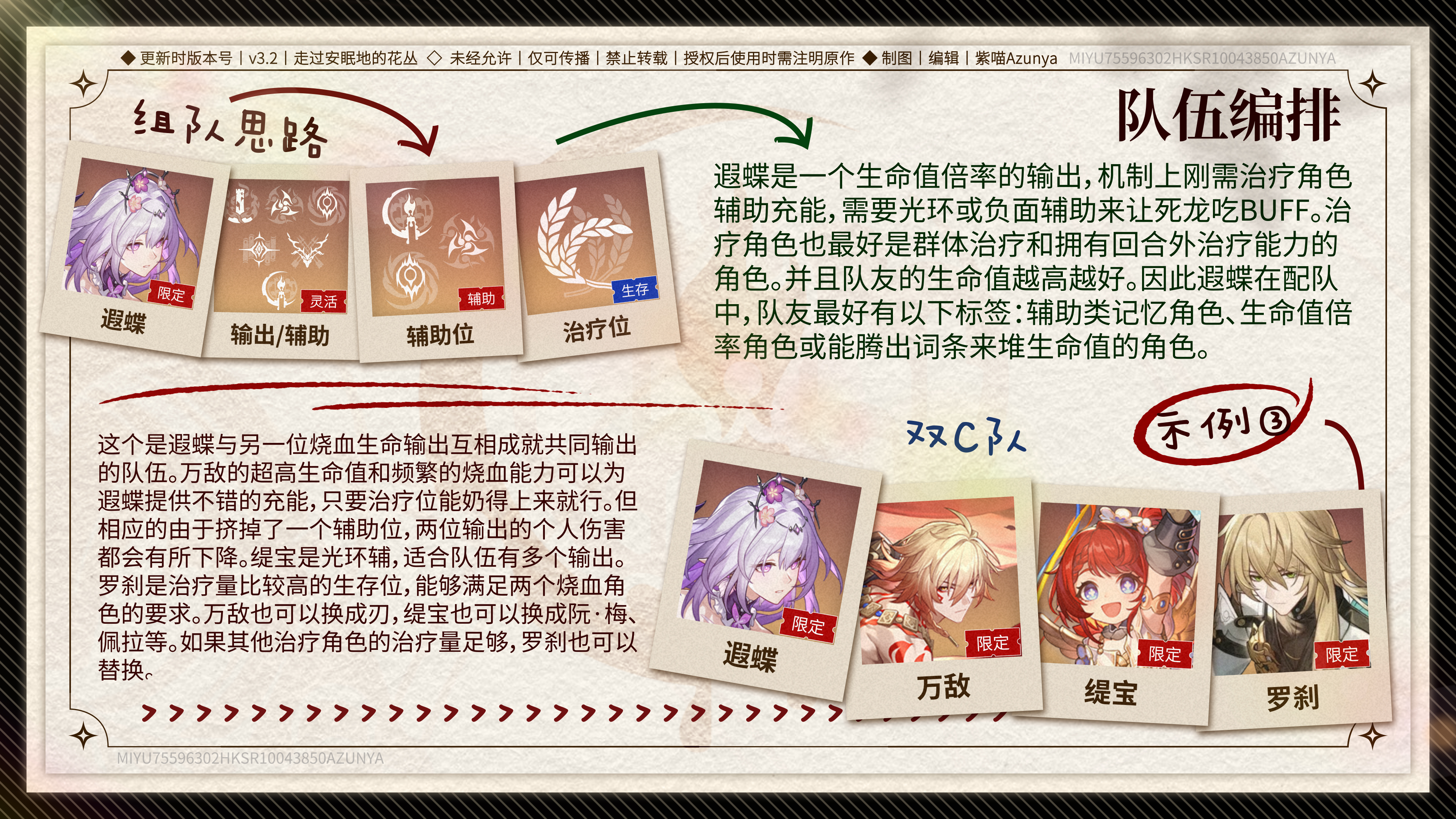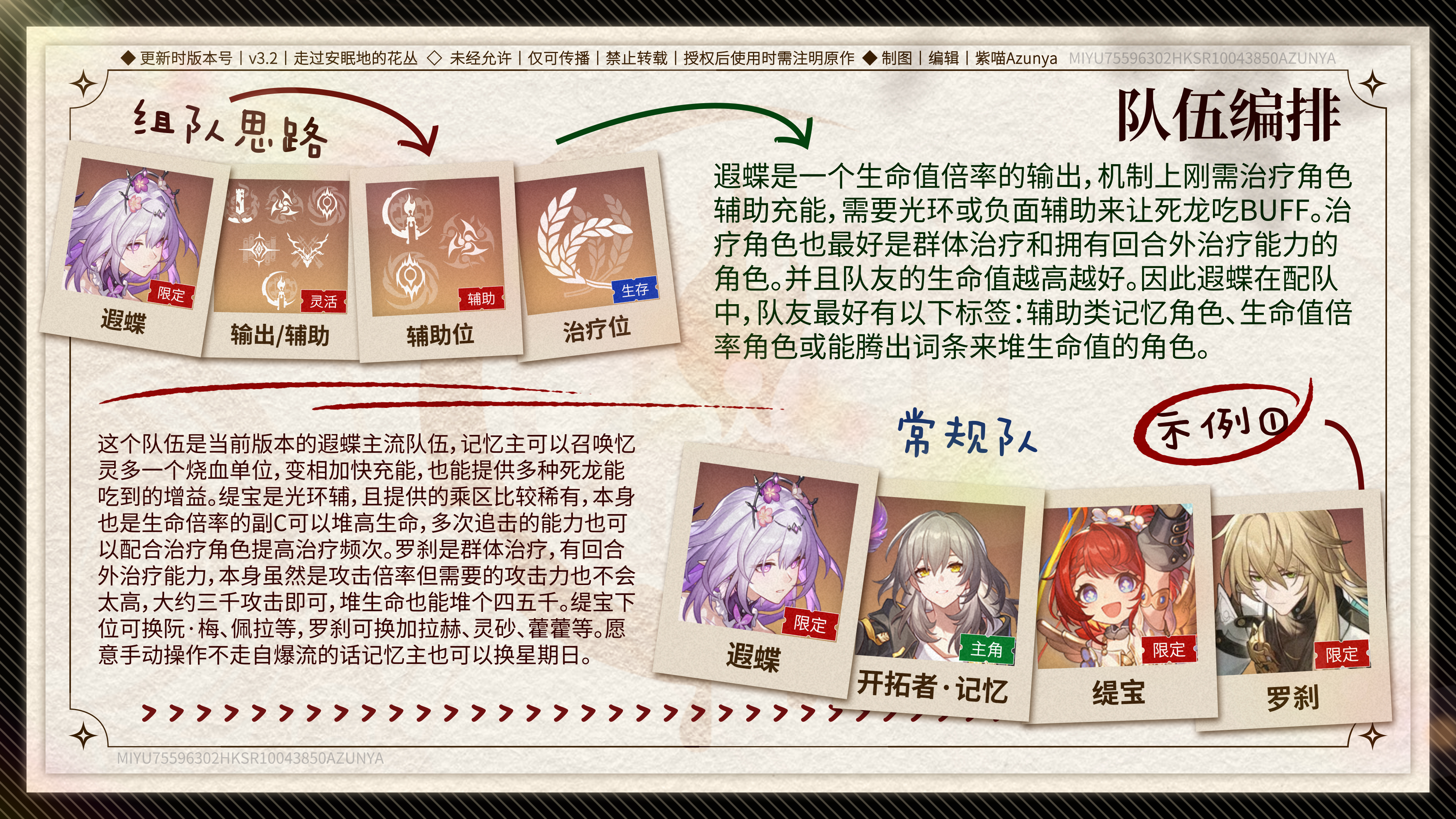 这个队伍是当前版本的遐蝶主流队伍,记忆主可以召唤忆灵多一个烧血单位,变相加快充能,也能提供多种死龙能吃到的增益。缇宝是光环辅,且提供的乘区比较稀有,本身也是生命倍率的副C可以堆高生命,多次追击的能力也可以配合治疗角色提高治疗频次。罗刹是群体治疗,有回合外治疗能力,本身虽然是攻击倍率但需要的攻击力也不会太高,大约三千攻击即可,堆生命也能堆个四五千。缇宝下位可换阮·梅、佩拉等,罗刹可换加拉赫、灵砂、藿藿等。愿意手动操作不走自爆流的话记忆主也可以换星期日。