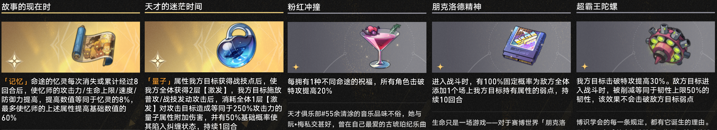 【粉红冲撞】提供高额击破特攻加成,见到鸡尾酒事件千万别错过;【超霸王陀螺】则提供蚊子腿击破特攻加成——总比没有好。
