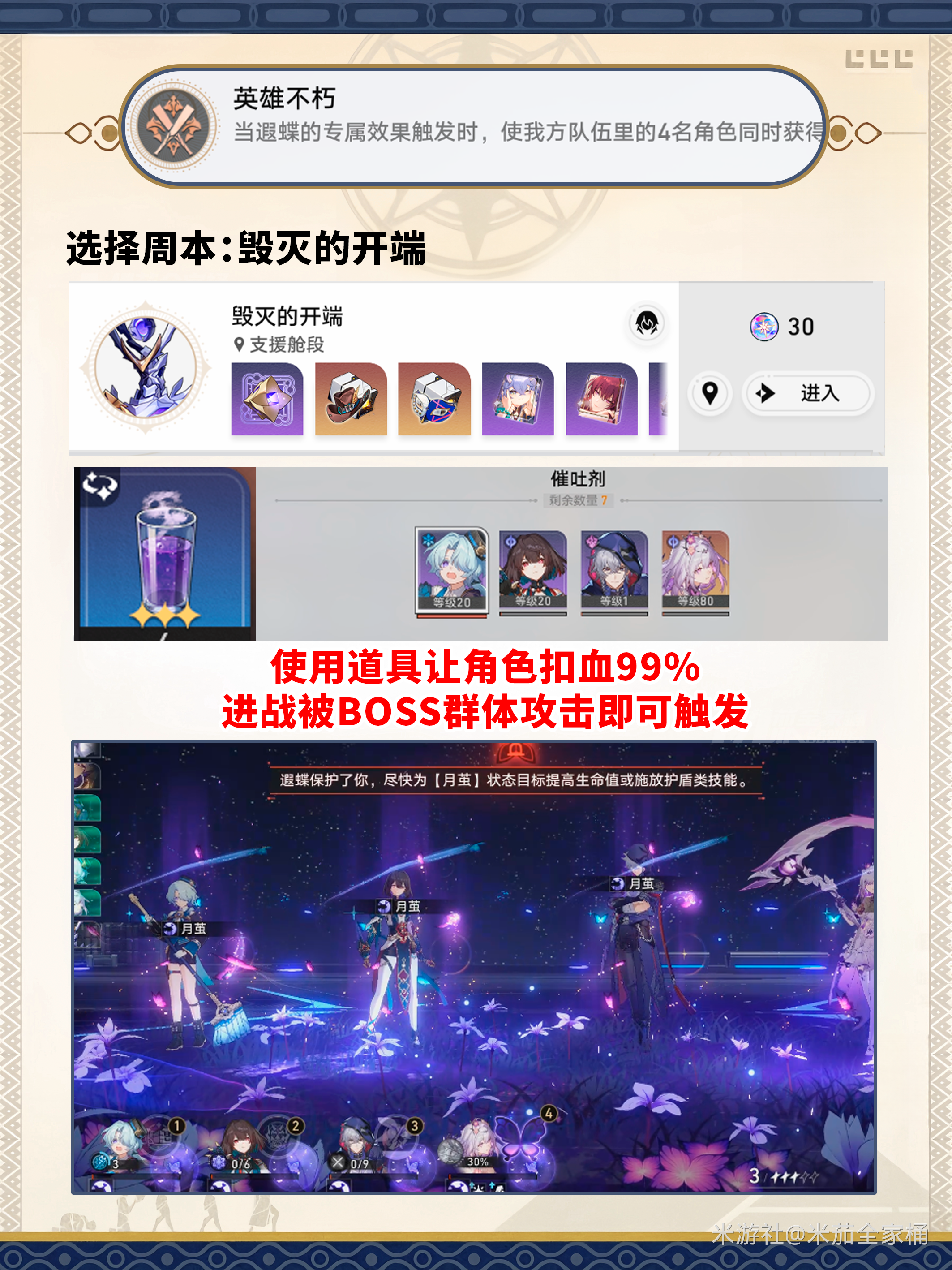 就在最近崩坏星穹铁道终于上线了3.2版本给我们带来新冒险,这次版本更新还上线了许多新内容,有新遗器,新地图,新角色,还有新成就,那么有小伙伴好奇英雄不朽成就怎么做,下面就来告诉大家。 崩坏星穹铁道英雄不朽成就攻略 英雄不朽 可以使用道具让角色扣血99%进战被BOSS群体攻击即可触发 本文内容来源于互联网,如有侵权请联系删除。