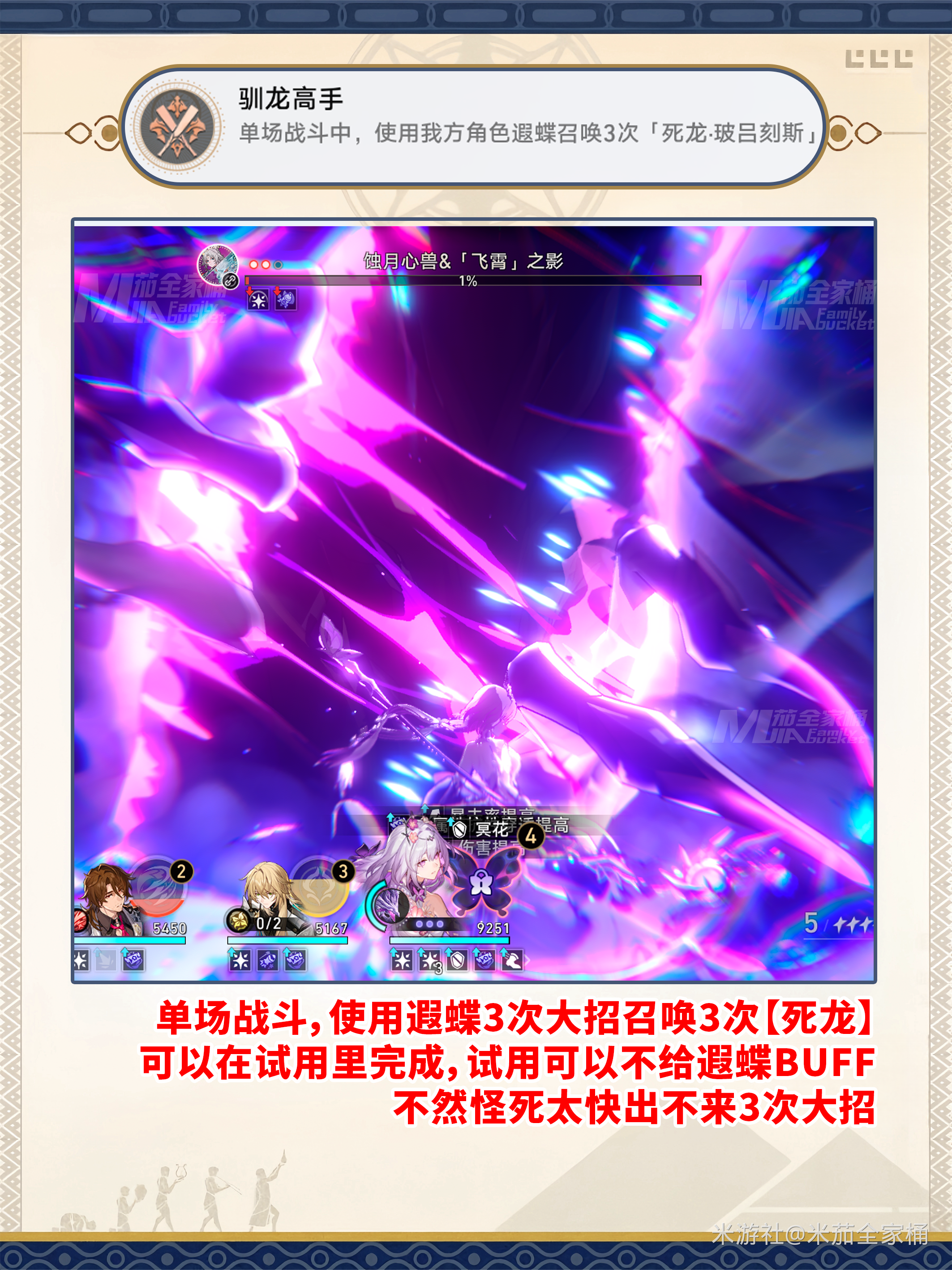 就在最近崩坏星穹铁道终于上线了3.2版本给我们带来新冒险,这次版本更新还上线了许多新内容,有新遗器,新地图,新角色,还有新成就,那么有小伙伴好奇驯龙高手成就怎么做,下面就来告诉大家。 崩坏星穹铁道驯龙高手成就攻略 驯龙高手 单场战斗,使用遐蝶3次大招召唤3次【死龙可以在试用里完成,试用可以不给遐蝶BUFF不然怪死太快出不来3次大招 本文内容来源于互联网,如有侵权请联系删除。