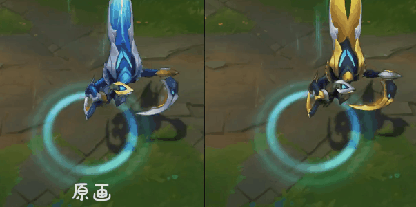 腾空而起的卡兹尔会慢慢的将自己翅膀下的战队旗帜展开,将会出现IG和RNG的队标,而IG卡兹克炫彩整体造型为银色,RNG整体造型为黄色。