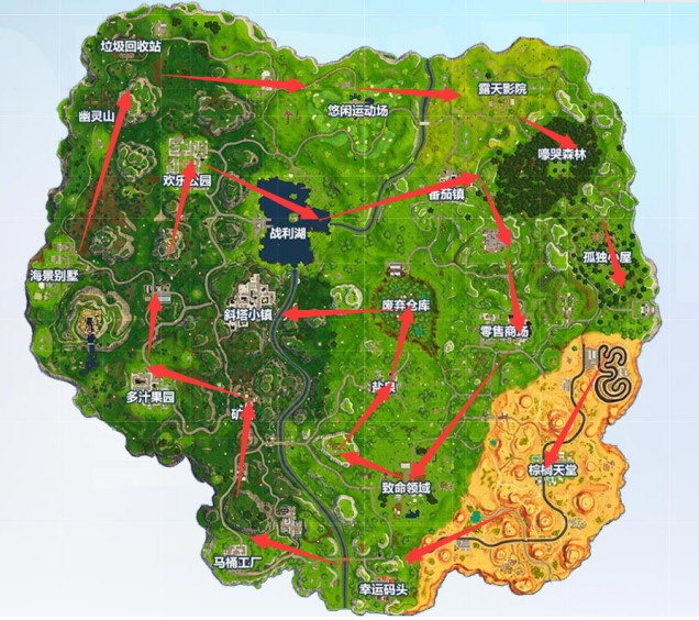 搜索宝箱位置:海景别墅,战利湖,致命领域,马桶工厂,垃圾回收站,孤独小屋,盐泉,棕榈天堂,多汁果园,欢乐公园,矿井,零售商场,幸运码头,嚎哭深林,幽灵山。