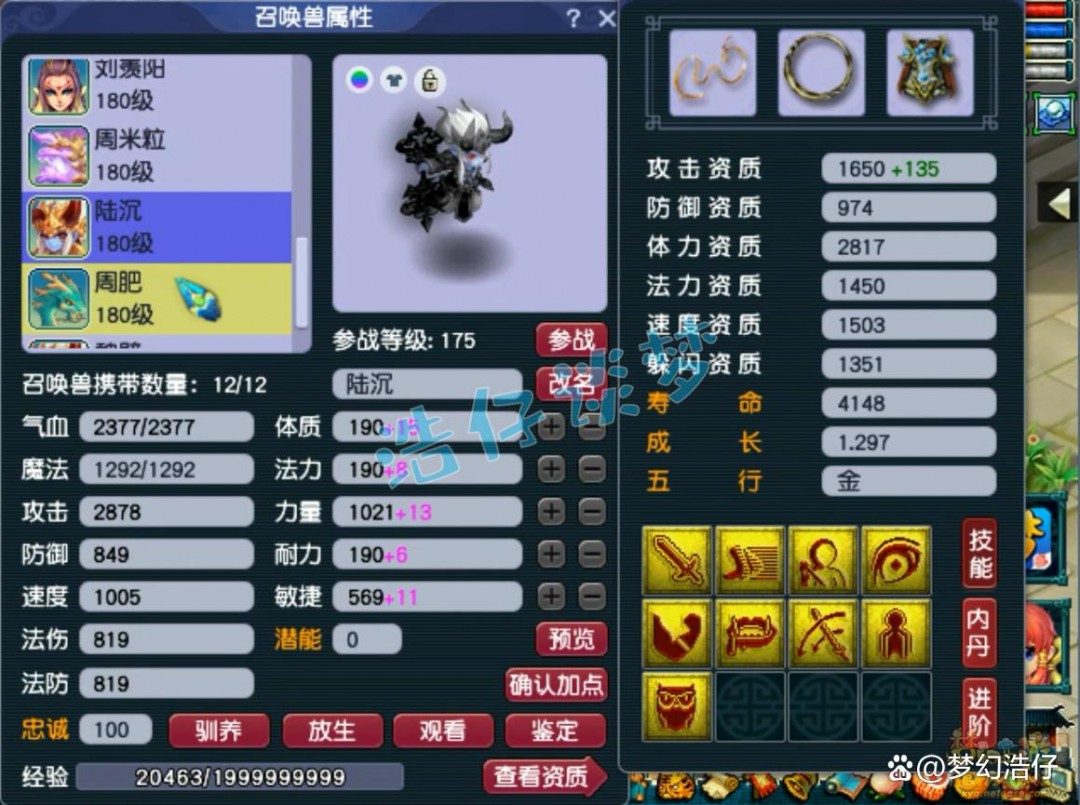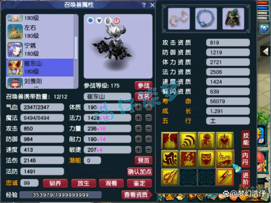 175级方寸没打满临时符的面板属性,他主玩的是封方寸,这是接近全敏加点的属性,速度达到了2059,但是牺牲了很多其他属性!