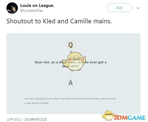"是的,我们正在努力为他们制作新皮肤。克烈的新皮肤,应该能够在今年年底的时候上线,至于卡蜜尔的话,她也会获得一个新皮肤。"