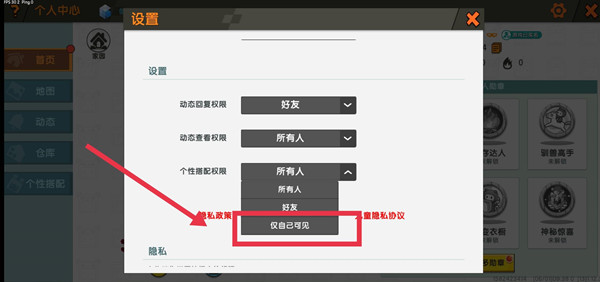 3、最后我们在设置的界面找到皮肤隐私栏目,然后设置为仅自己可见就可以了。