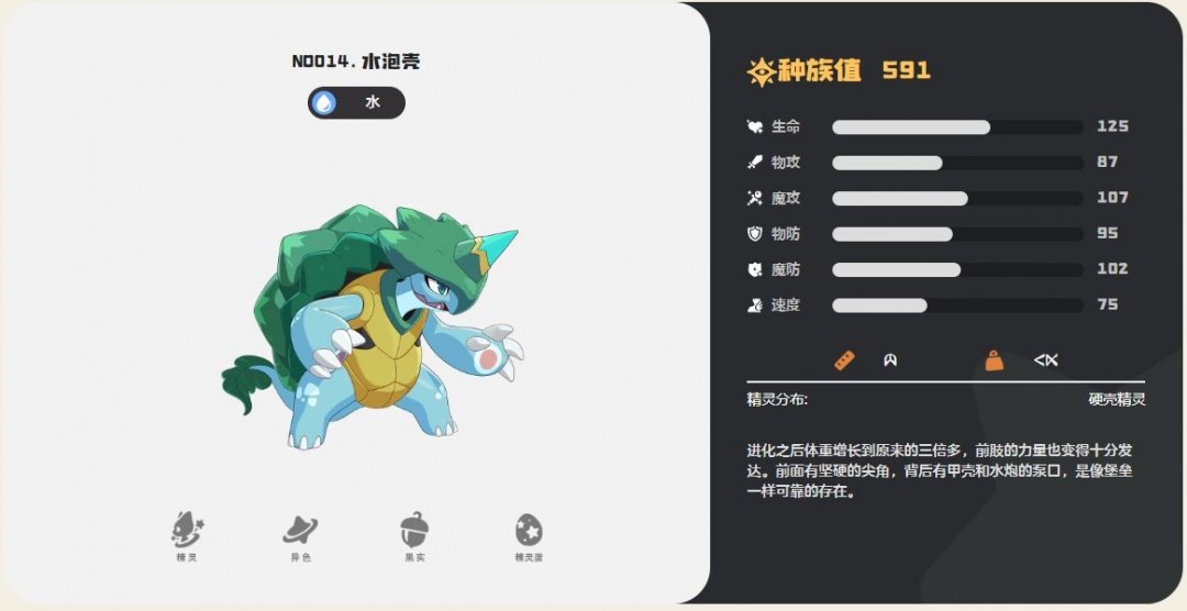 进化之后体重增长到原来的三倍多,前肢的力量也变得十分发达。前面有坚硬的尖角,背后有甲壳和水炮的泵口,是像堡垒一样可靠的存在。