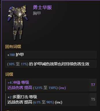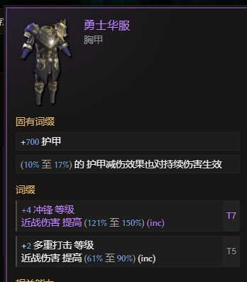 胸甲:勇士华服最好高护甲还能转出近战点伤,其他也行,保证前2个词缀即可,也和头盔一样不限定词缀,近战%的组合即可。